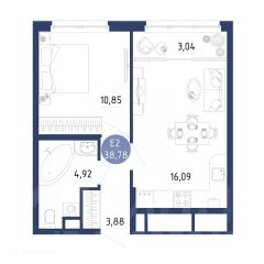 1 комн. квартира в ЖК Бульвар оптимистов, площадь 38.78 м², жилая 10.85 м², кухня 19.13 м²