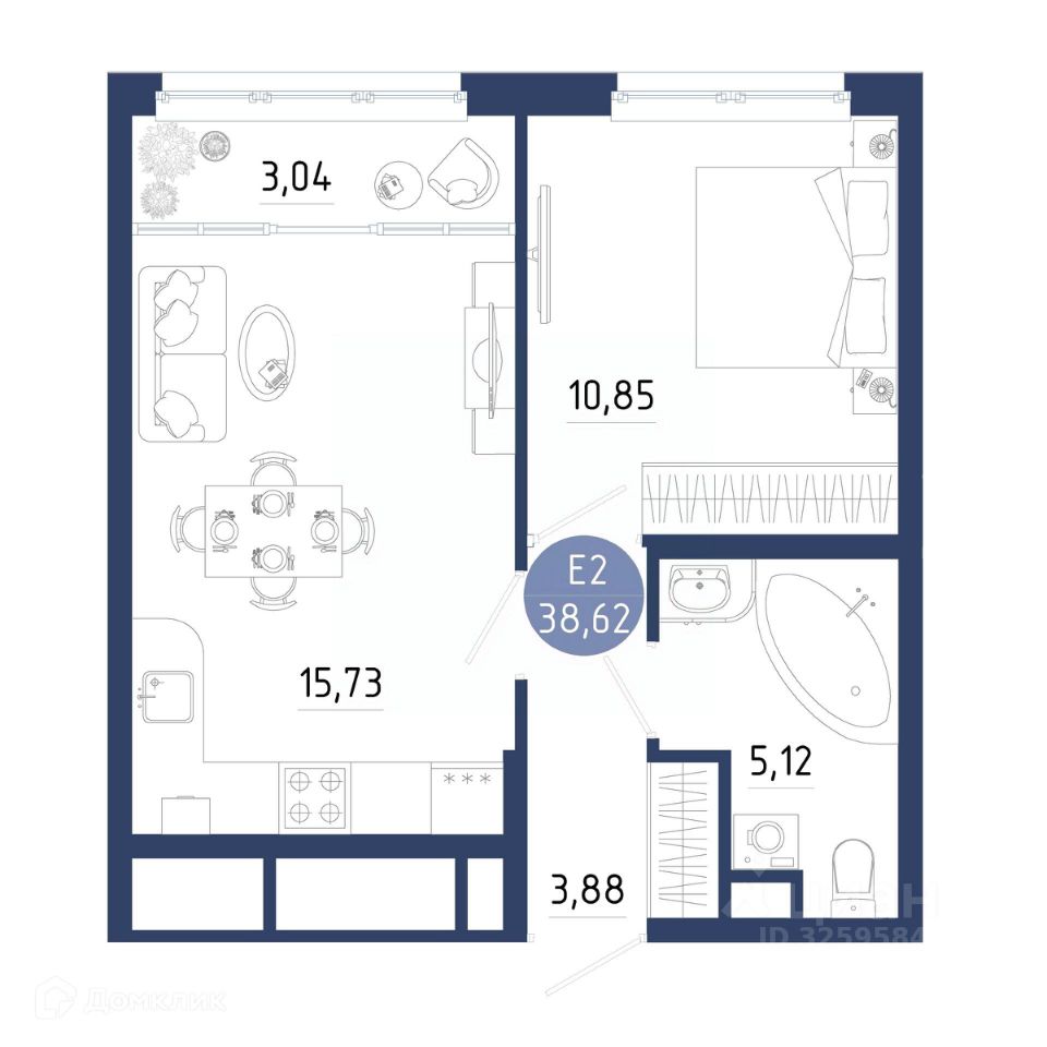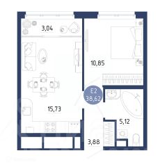 1 комн. квартира в ЖК Бульвар оптимистов, площадь 38.62 м², жилая 10.85 м², кухня 18.77 м²