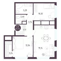 2 комн. квартира в ЖК Крылья, площадь 59.74 м², жилая 22.36 м², кухня 17.06 м²