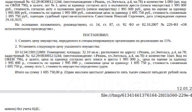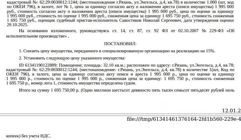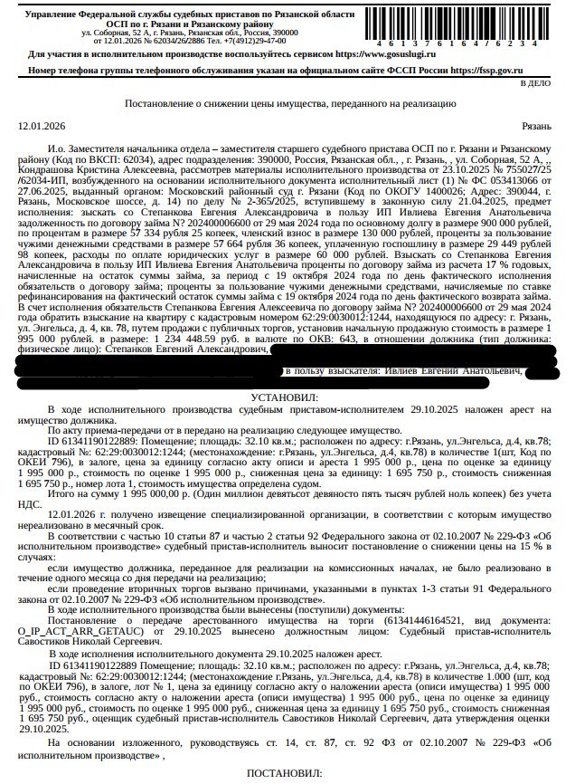 Помещение, назначение: жилое, наименование: квартира, площадь 32,1 кв.м., кадастровый номер 62:29:0030012:1244, местоположение: г.Рязань, ул.Энгельса, д.4, кв.78. Согласно справке ООО "Р-Энергия" от 12.11.2025 г. по данному адресу зарегистрирован 1 человек, задолженность по взносам на капитальный ремонт составляет 41 879,76 руб. Взыскатель, в пользу которого обращено взыскание Ивлиев Е.А. Согласно выписке ЕГРН от 07.11.2025 имеются сведения о залоге имущества в пользу КПК "Партнер Финанс". Реализация имущества должника не лишает права залогодержателя на обращение взыскания на предмет залога. Начальная цена: 1 695 750 (Один миллион шестьсот девяносто пять тысяч семьсот пятьдесят) руб. 00 коп., без НДС. Задаток: 80 000 (Восемьдесят тысяч) руб. 00 коп. Шаг аукциона 1%: 16 957 (Шестнадцать тысяч девятьсот пятьдесят семь) руб. 50 коп.
