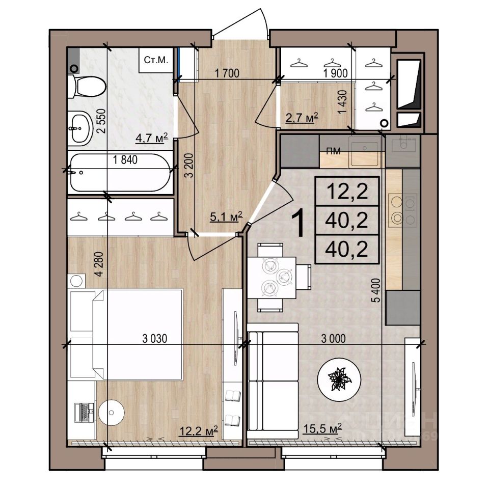 Квартира 191, 1-комнатная в ЖК Полярная звезда от компании "Зеленый сад". Московский район, развитая инфраструктура. Купить квартиру в новостройке в Рязани: 40.2 кв.м., 2 этаж. Кухня — 15.5 кв.м. Ипотека, Trade-In. Подробности на нашем сайте