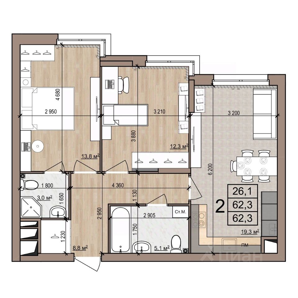 62,3 м²