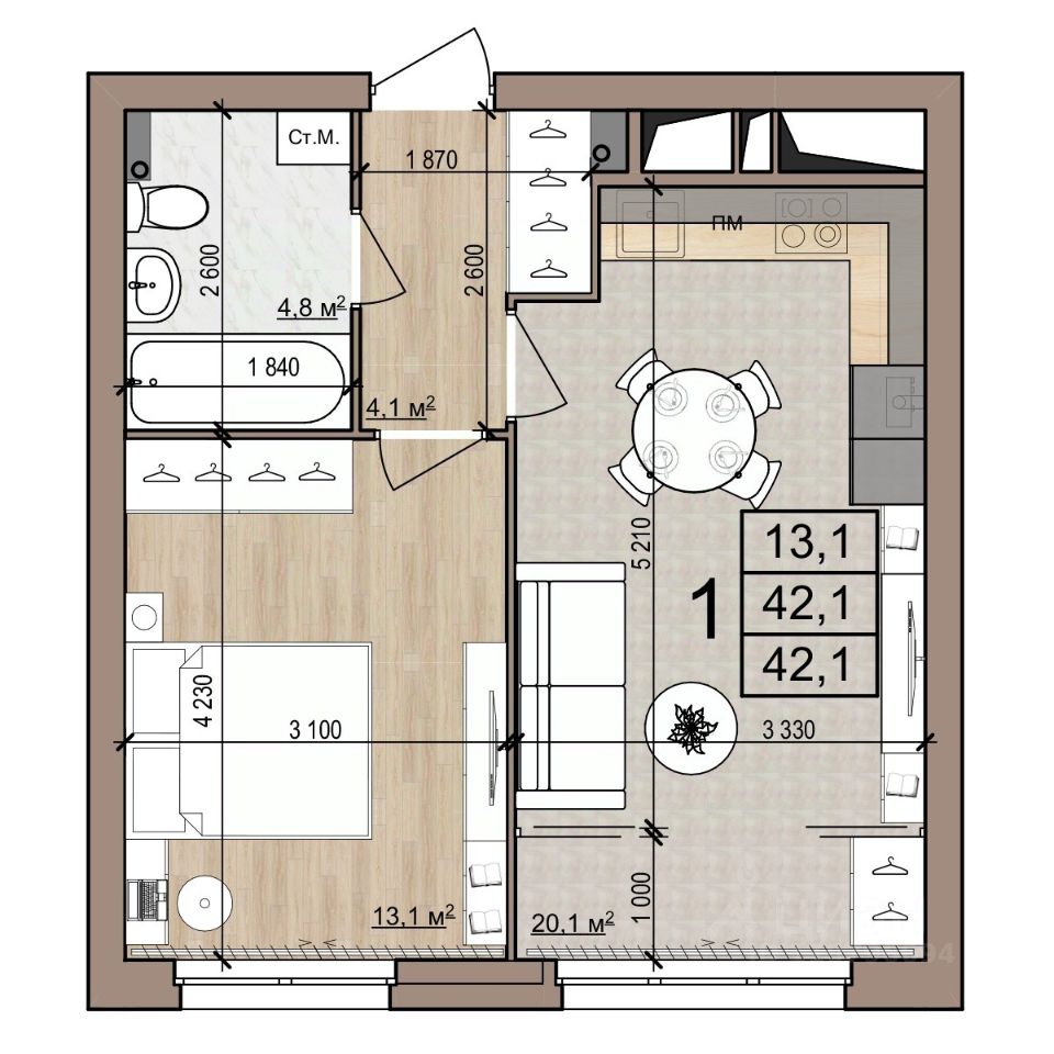 Квартира 278, 1-комнатная в ЖК Полярная звезда от компании "Зеленый сад". Московский район, развитая инфраструктура. Купить квартиру в новостройке в Рязани: 42.1 кв.м., 11 этаж. Кухня — 20.4 кв.м. Ипотека, Trade-In. Подробности на нашем сайте