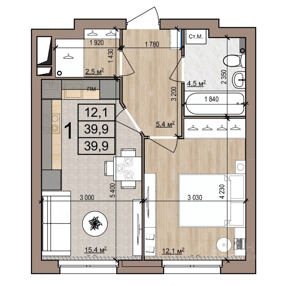 39,9 м²