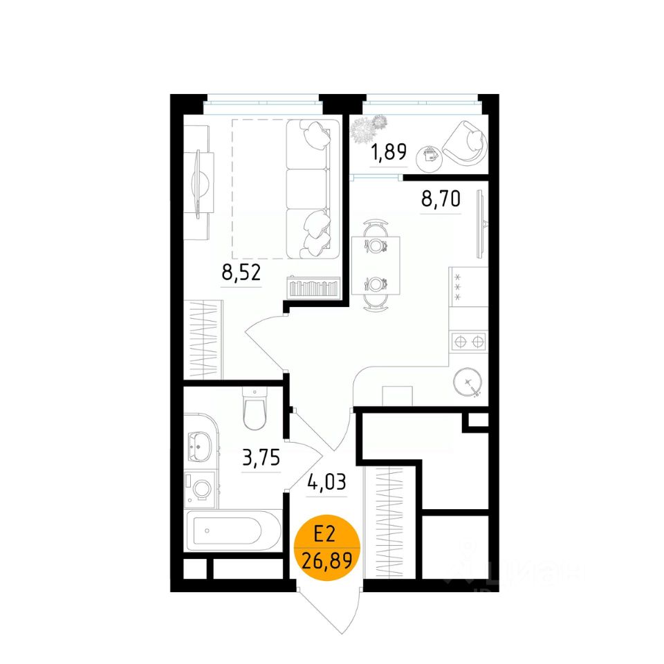 Здесь планировка с кухней-гостиной, отдельной спальней и гардеробной. Потолки выше, чем обычно, окна почти во всю стену — комната наполнена светом и не давит.