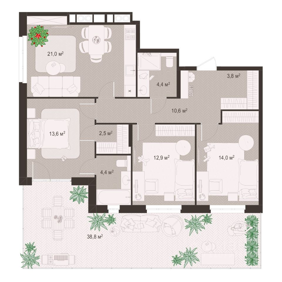 Квартира с собственной террасой! Вы покупаете не только жильё, но и собственный зеленый дворик для барбекю, детского бассейна, качелей, тренажёрного зала, летней оранжереи и так далее - на ваш вкус.