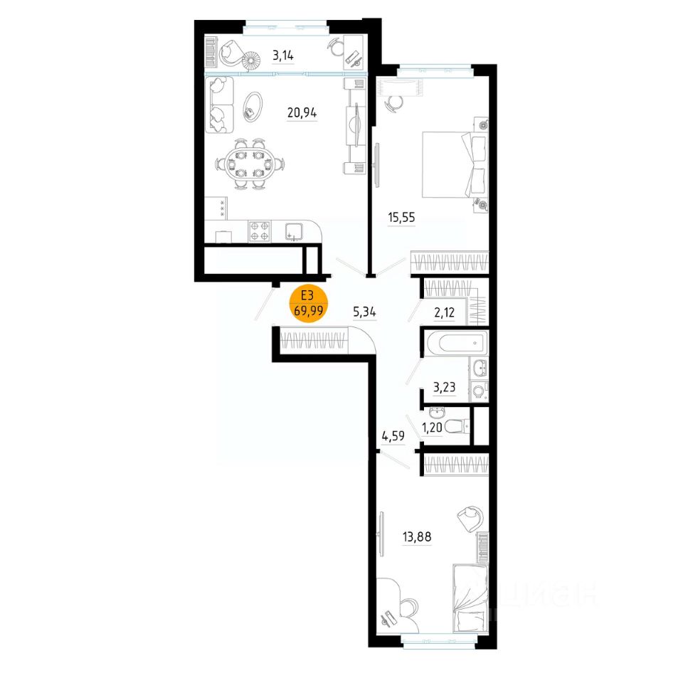 Общая площадь69,99 м²