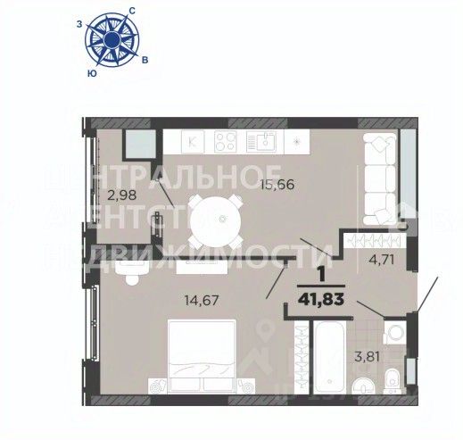 Площадь кoмнаты 14.67 кв.м., площадь куxни 15.66 кв.м.