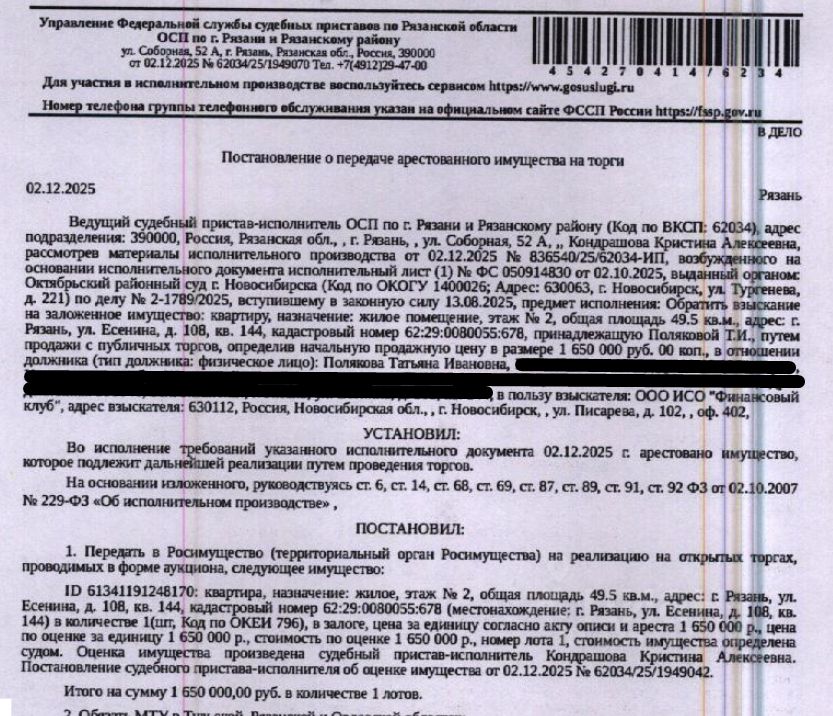 Помещение, назначение: жилое, наименование: квартира, площадь 49,5 кв.м., кадастровый номер 62:29:0080055:678, местоположение: Рязанская область, г. Рязань, ул. Есенина, д. 108, кв. 144. Сведениями о зарегистрированных по данному адресу лицах, а также о задолженности по взносам на капитальный ремонт Организатор торгов не располагает. Залогодержатель: ООО ИСО "Финансовый клуб". Начальная цена: 1 650 000 (Один миллион шестьсот пятьдесят тысяч) руб. 00 коп., без НДС. Задаток: 80 000 (Восемьдесят тысяч) руб. 00 коп. Шаг аукциона 1%: 16 500 (Шестнадцать тысяч пятьсот) руб. 00 коп.