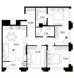 Семейная квартира 95,1 м с мастер-спальней и клубной инфраструктурой.