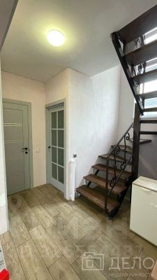 В квартире выполнен современный качественный ремонт, полностью укомплектована всей необходимой мебелью и техникой. Лестница с деревянными ступенями и кованными перилами, входная дверь также украшена декоративным кованным орнаментом.