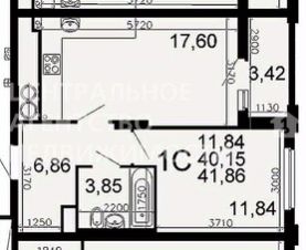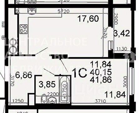 Общая площадь квартиры 40,4 м.кв. + лоджия 3,4 м.кв. = 43,8 м.кв., кухня-гостинная 17,6 м.кв., спальня 12 м.кв.