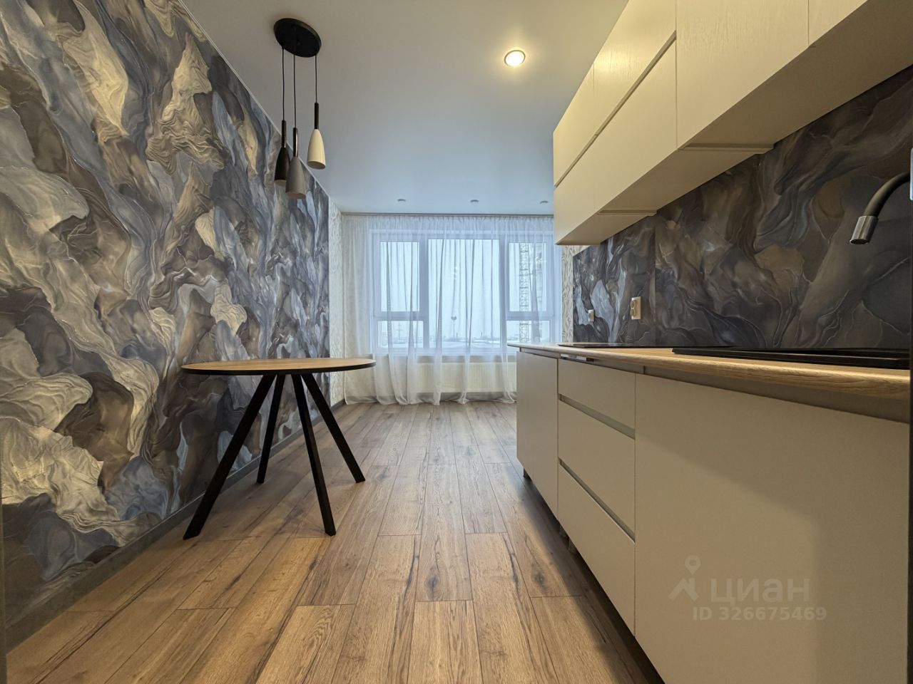 - встpоенный кухонный гapнитуp c техникой, обеденная зона, зонирование светом;