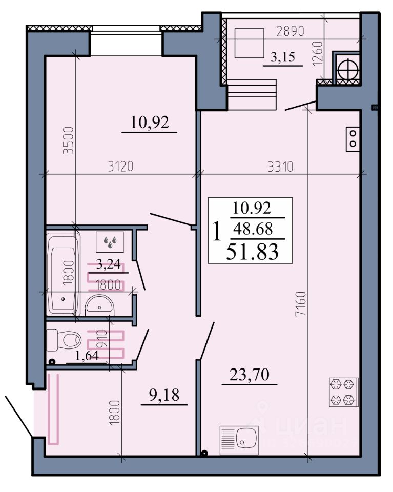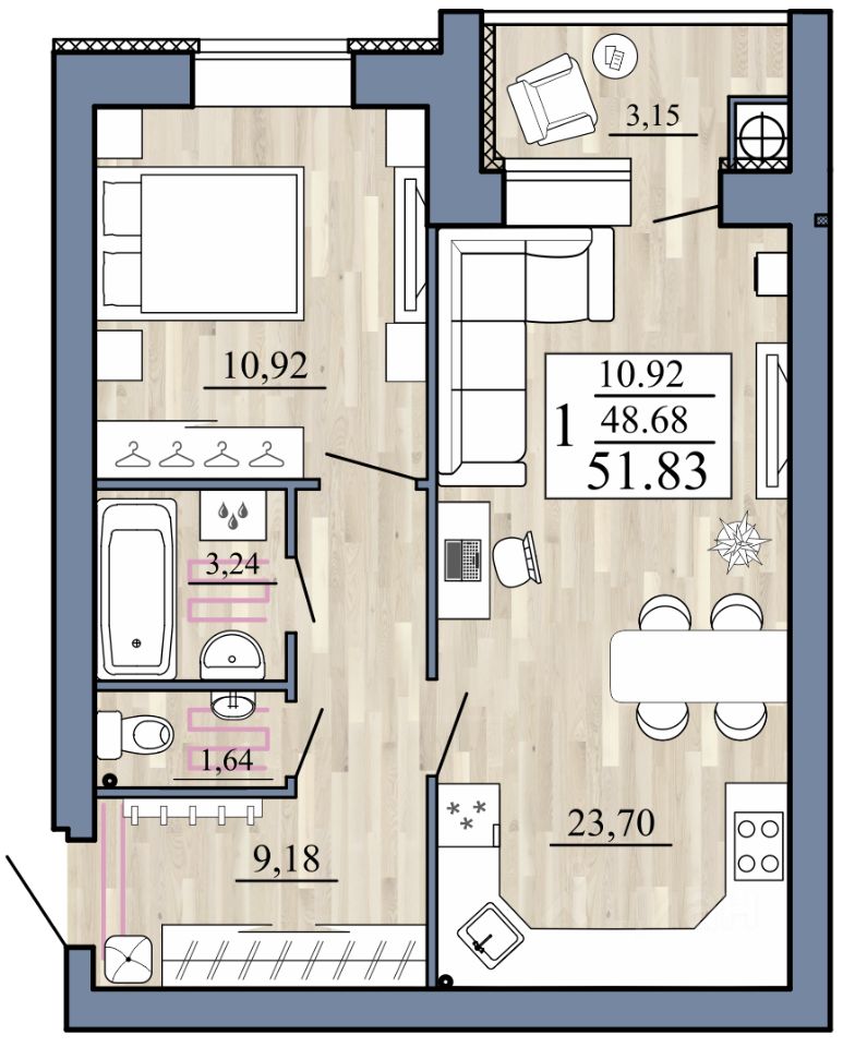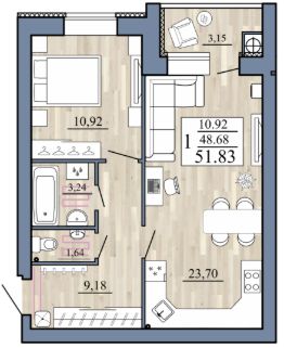 Современная однокомнатная квартира европланировки площадью 51,83 кв.м, идеально подходящую для комфортной жизни.