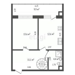 Просторная кухня площадью 12,5 квадратных метра. В квартире 3 жилые комнаты общей площадью 40,1 кв.м., включая 1 комнату (13,6 кв.м.) на первом уровне и 2 комнаты (14,8 и 11,7 кв.м.) на втором уровне. На каждом этаже свой санузел, оба отделаны плиткой и оснащены всей рабочей сантехникой. Также есть просторные лоджии на первом и втором уровнях квартиры, которые могут служить полноценными террасами или рабочим кабинетом.