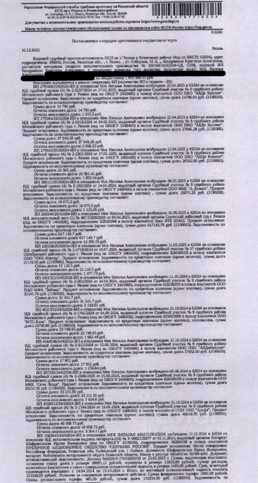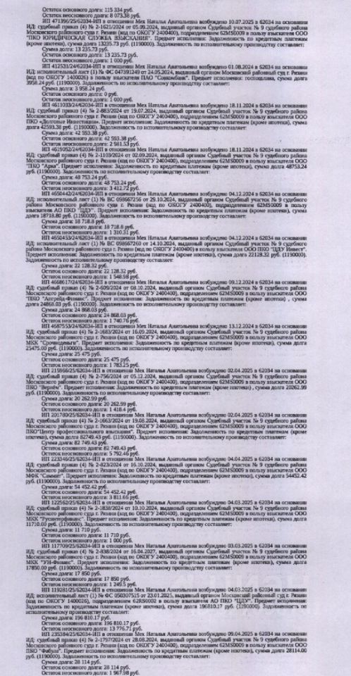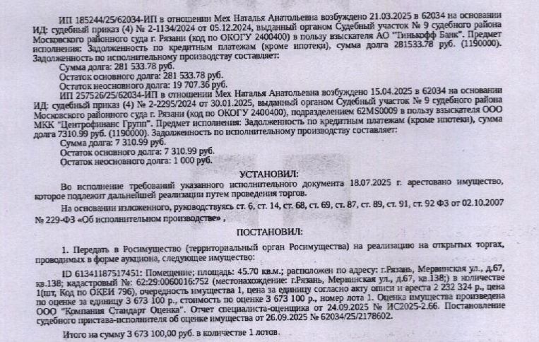 Помещение, назначение: жилое, наименование: квартира, площадь 45,7 кв.м., кадастровый номер 62:29:0060016:752, местоположение: г. Рязань, Мервинская ул., д. 67, кв. 138. Согласно справке ООО "Р-Энергия" от 27.12.2025 г. по данному адресу зарегистрировано 2 человека, задолженность по взносам на капитальный ремонт составляет 18 474,78 руб. Взыскатели, в пользу которых обращено взыскание Банк ВТБ (ПАО), ООО ПКО "АйДи Коллект" и др. Согласно выписке ЕГРН от 25.12.2025 имеются сведения о залоге имущества в пользу КПК "ПАНДА". Реализация имущества должника не лишает права залогодержателя на обращение взыскания на предмет залога. Информация об остатке задолженности на момент публикации информационного сообщения у Организатора торгов отсутствует. Начальная цена: 3 673 100 (Три миллиона шестьсот семьдесят три тысячи сто) руб. 00 коп., без НДС. Задаток: 180 000 (Сто восемьдесят тысяч) руб. 00 коп. Шаг аукциона 1%: 36 731 (Тридцать шесть тысяч семьсот тридцать один) руб. 00 коп.