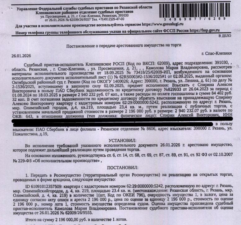 Помещение, назначение: жилое, наименование: квартира, площадь 23,4 кв.м., кадастровый номер 62:29:0000000:5242, адрес: Российская Федерация, Рязанская область, городской округ город Рязань, город Рязань, микрорайон Олимпийский городок, дом 4, квартира 219. Сведениями о зарегистрированных по данному адресу лицах Организатор торгов не располагает. Согласно справке ООО "Р-Энергия" от 29.01.2026 г. задолженность по взносам на капитальный ремонт составляет 3 791,95. Залогодержатель: ПАО "Сбербанк России". Начальная цена: 2 196 000 (Два миллиона сто девяносто шесть тысяч) руб. 00 коп., без НДС. Задаток: 100 000 (Сто тысяч) руб. 00 коп. Шаг аукциона 1%: 21 960 (Двадцать одна тысяча девятьсот шестьдесят) руб. 00 коп.
