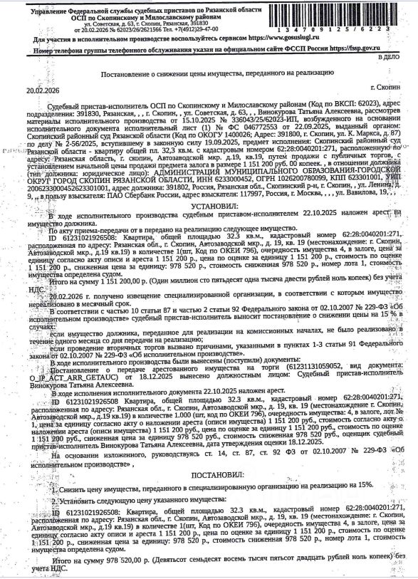 Помещение, назначение: жилое, наименование: квартира, площадь 32,3 кв.м., кадастровый номер 62:28:0040201:271, адрес: Российская Федерация, Рязанская область, городской округ город Скопин, город Скопин, микрорайон Автозаводской, дом 19, квартира 19. Сведениями о зарегистрированных по данному адресу лицах, а также о задолженности по взносам на капитальный ремонт Организатор торгов не располагает. Залогодержатель: ПАО "Сбербанк России". Начальная цена: 978 520 (Девятьсот семьдесят восемь тысяч пятьсот двадцать) руб. 00 коп., без НДС. Задаток: 40 000 (Сорок тысяч) руб. 00 коп. Шаг аукциона 1%: 9 785 (Девять тысяч семьсот восемьдесят пять) руб. 20 коп.