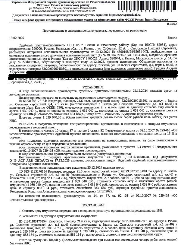 Помещение, назначение: жилое, наименование: квартира, площадь 21,6 кв.м., кадастровый номер 62:29:0020015:801, местоположение: Рязанская область, г. Рязань, ул. Сельских Строителей, д. 4, корп. 1, кв. 46. Сведениями о зарегистрированных по данному адресу лицах, а также о задолженности по взносам на капитальный ремонт Организатор торгов не располагает. Залогодержатель: ПАО "Транскапиталбанк". Начальная цена: 883 184 (Восемьсот восемьдесят три тысячи сто восемьдесят четыре) руб. 00 коп., без НДС. Задаток: 40 000 (Сорок тысяч) руб. 00 коп. Шаг аукциона 1%: 8 831 (Восемь тысяч восемьсот тридцать один) руб. 84 коп.
