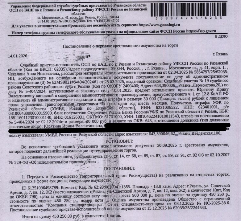Помещение, назначение: жилое, наименование: жилое помещение, площадь 13,8 кв.м., кадастровый номер 62:29:0070041:1355, местоположение: г.Рязань, ул.Советской Армии, д.7, кв. 12, Ж2. Согласно справке ООО "Р-Энергия" от 29.01.2026 по данному адресу зарегистрирован 1 человек, задолженность по взносам на капитальный ремонт составляет 288,85 руб. Взыскатель: УМВД России по Рязанской области. Начальная цена: 450 250 (Четыреста пятьдесят тысяч двести пятьдесят) руб. 00 коп., без НДС. Задаток: 220 000 (Двести двадцать тысяч) руб. 00 коп. Шаг аукциона 1%: 4 502 (Четыре тысячи пятьсот два) руб. 50 коп.