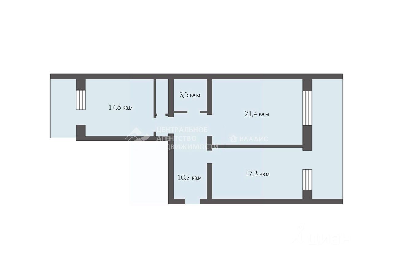 Две изолированные комнаты (14,8 кв. м и 21,4 кв. м) и просторная кухня (17,3 кв. м),
