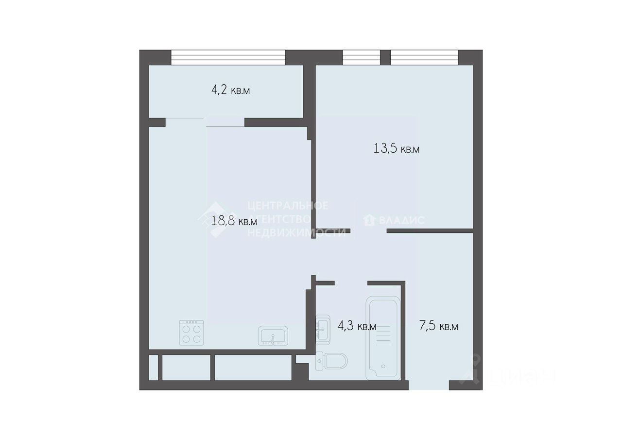 Квартира на 25-м этаже с прекрасным видом на "Новую Европу", общая площадь — 46,17 кв. м, из которых 13,5 кв. м — жилая площадь, 18,77 кв. м — кухня.