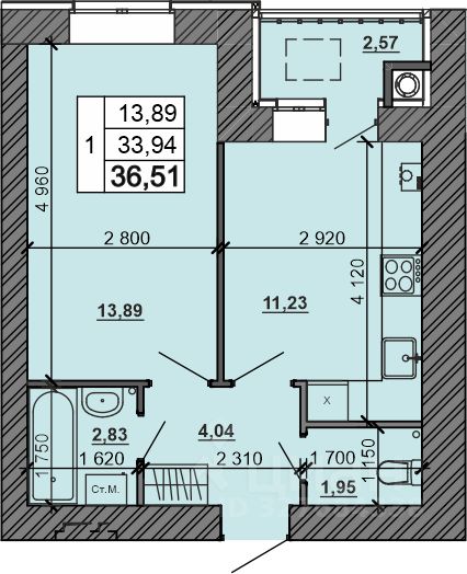 Общая площадь36,51 м²