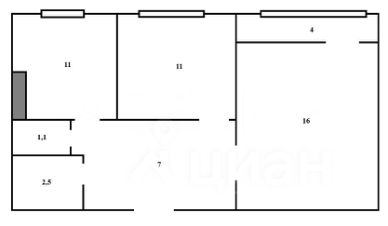 Общая площадь квартиры составляет 53 кв. м (без учета лоджии), кухня — 11 кв. м., комнаты — 11 и 16 кв. м., лоджия 4 кв.м, просторный холл.