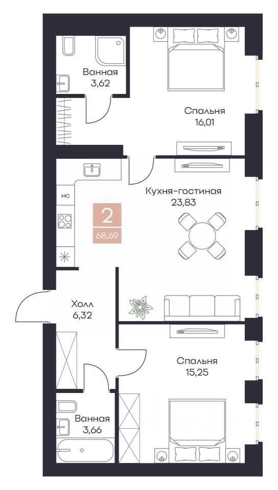 Общая площадь68,69 м²