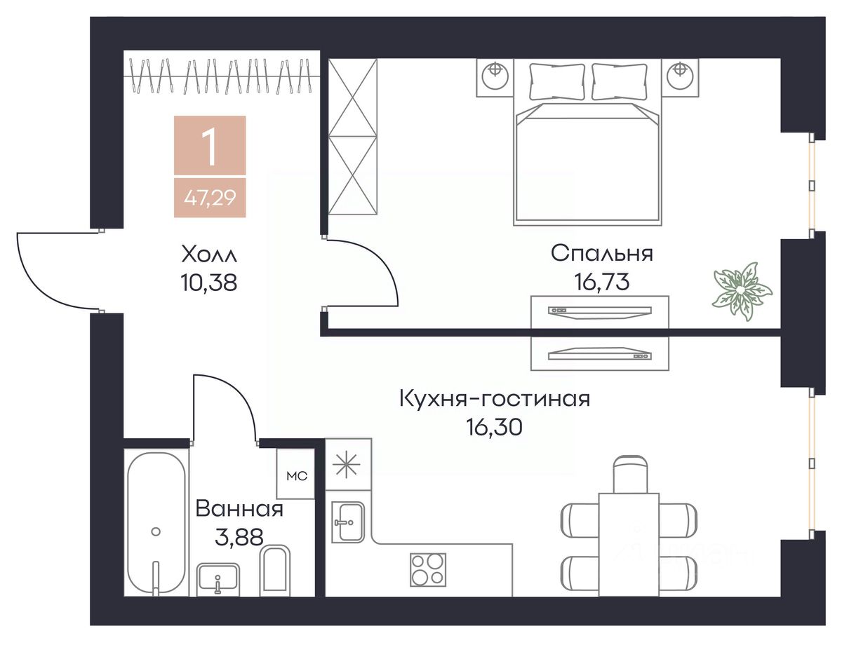 Общая площадь47,29 м²