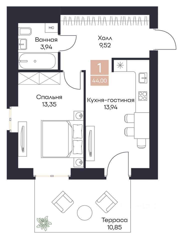 Общая площадь44,01 м²