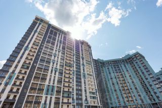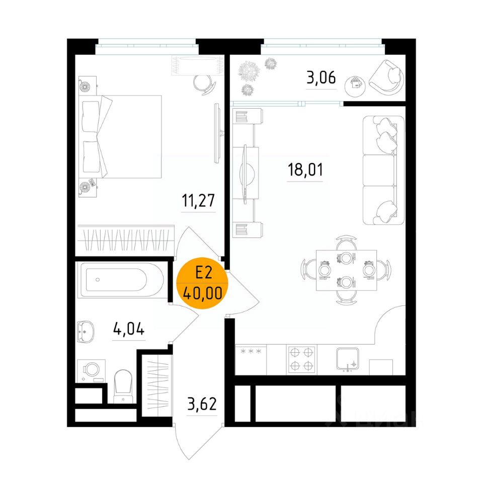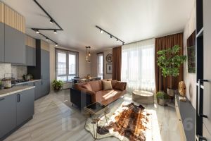 Здесь планировка с кухней-гостиной, отдельной спальней и гардеробной. Потолки выше, чем обычно, окна почти во всю стену — комната наполнена светом и не давит.