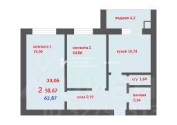 Общая площадь квартиры составляет 62 квадратных метра, из которых 33 квадратных метра — жилая площадь. Две комнаты изолированы, их площадь — 19 и 14 квадратных метра. Кухня площадью 11 квадратных метров идеально подойдёт для семейных ужинов и дружеских встреч. В подарок новый кухонный гарнитур!