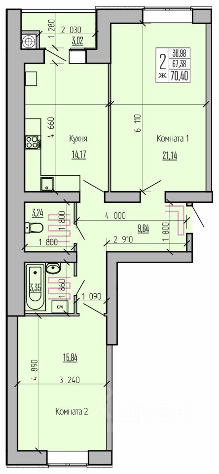 Двухкомнатная квартира европланировки площадью 70,40 кв.м Вместительная кухня-гостиная и две комфортабельные комнаты. Раздельный санузел и просторный коридор, где предусмотрено место для шкафов.