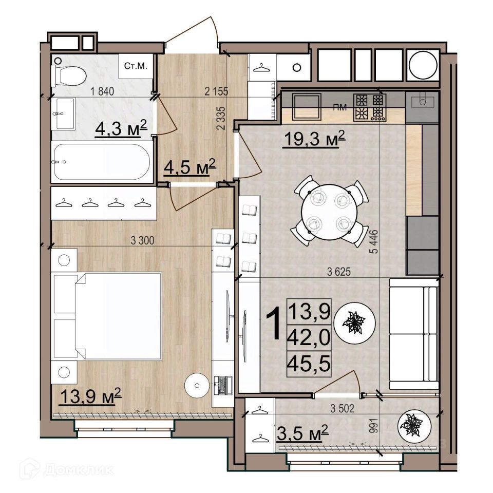 1 комн. квартира в ЖК Еврокласс-5, площадь 45.8 м², жилая 13.9 м², кухня 23.1 м²