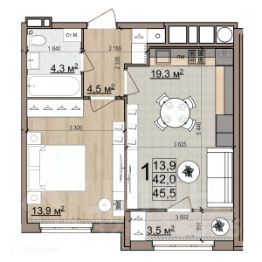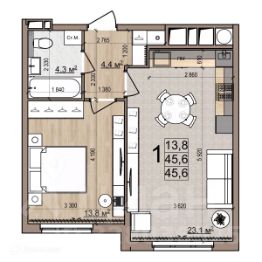 1 комн. квартира в ЖК Еврокласс-5, площадь 45.8 м², жилая 13.9 м², кухня 23.1 м²