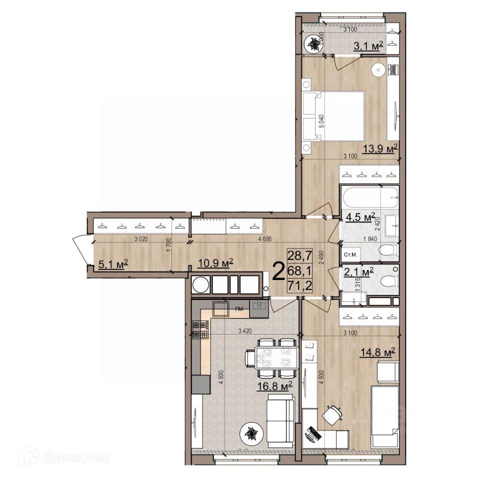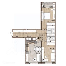 2 комн. квартира в ЖК Еврокласс-5, площадь 70.1 м², жилая 31.8 м², кухня 16.7 м²