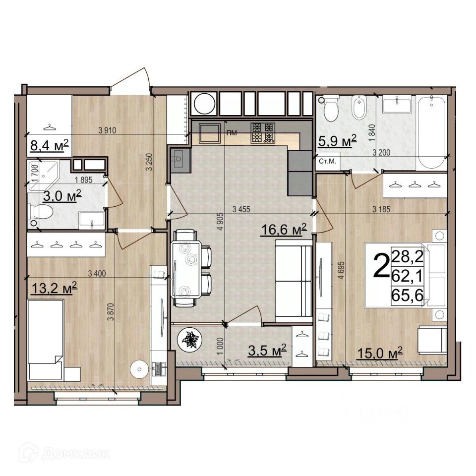 2 комн. квартира в ЖК Еврокласс-5, площадь 65.6 м², жилая 28.2 м², кухня 20.3 м²