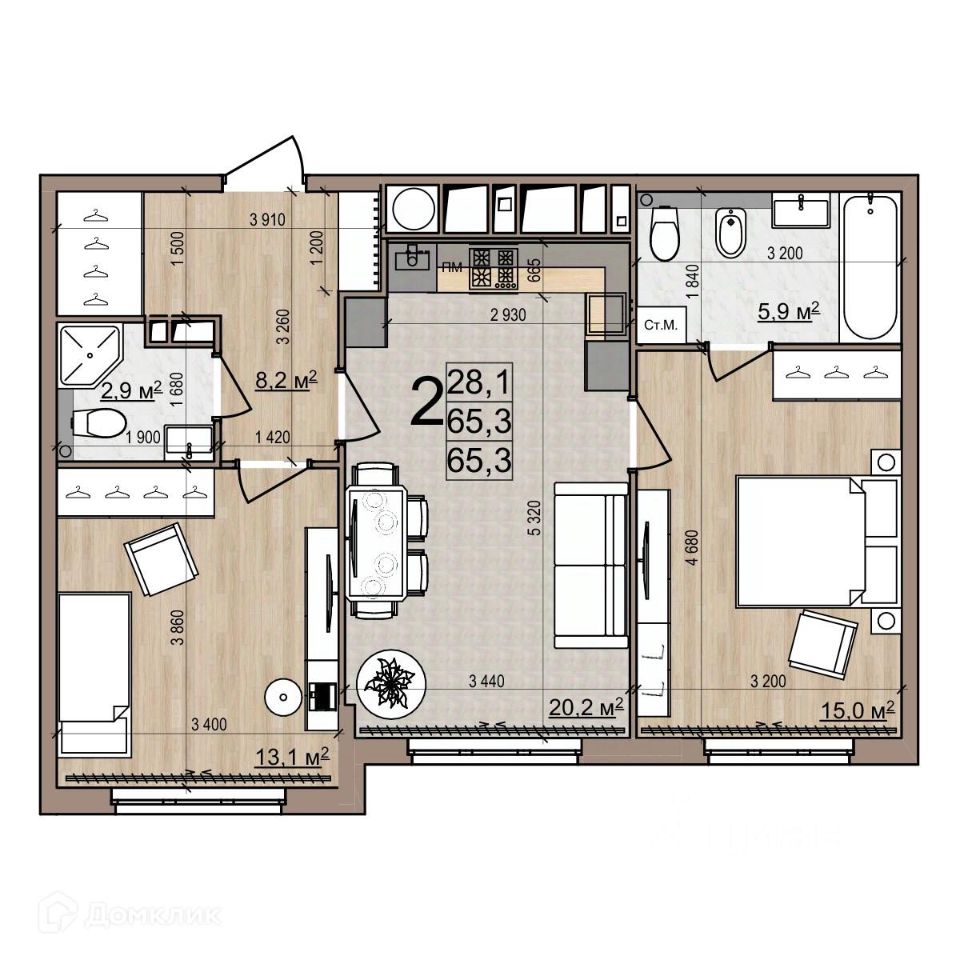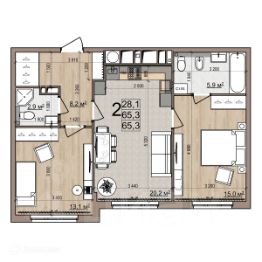 2 комн. квартира в ЖК Еврокласс-5, площадь 65.3 м², жилая 28.1 м², кухня 20.2 м²