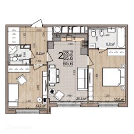 2 комн. квартира в ЖК Еврокласс-5, площадь 65.6 м², жилая 28.2 м², кухня 20.3 м²