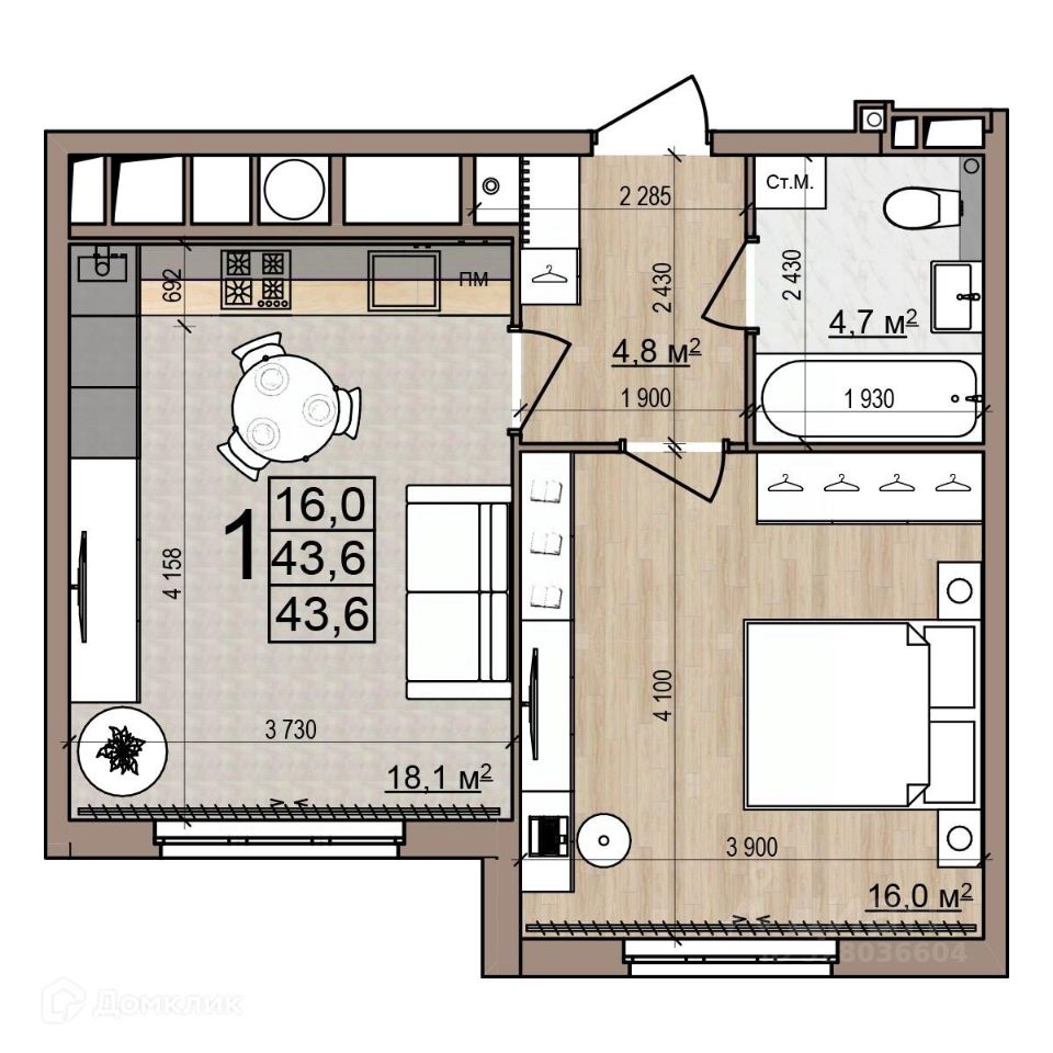 1 комн. квартира в ЖК Еврокласс-5, площадь 43.6 м², жилая 16 м², кухня 18.1 м²