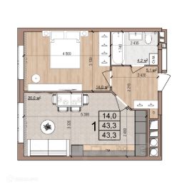 1 комн. квартира в ЖК Skyline (Скайлайн), площадь 43.3 м², жилая 14 м², кухня 20 м²