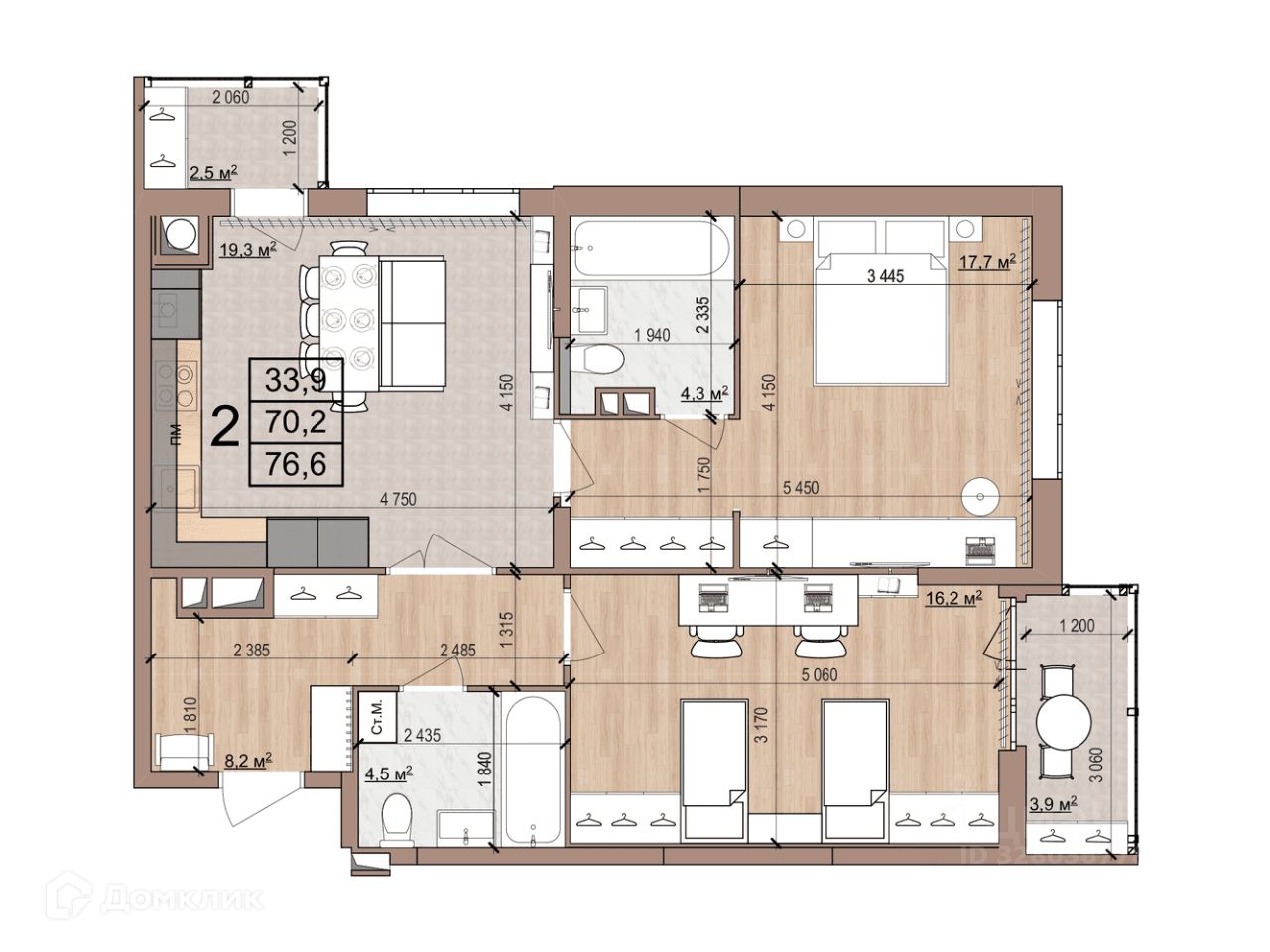 2 комн. квартира в ЖК Skyline (Скайлайн), площадь 76.6 м², жилая 33.9 м², кухня 19.3 м²