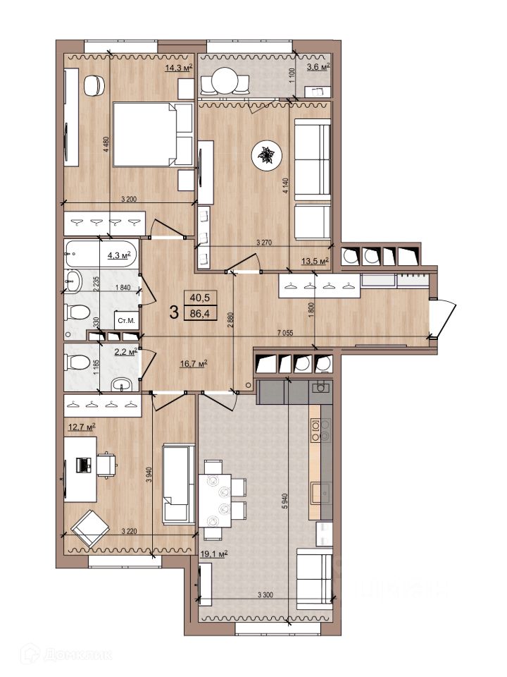 3 комн. квартира в ЖК Skyline (Скайлайн), площадь 86.4 м², жилая 40.5 м², кухня 19.1 м²