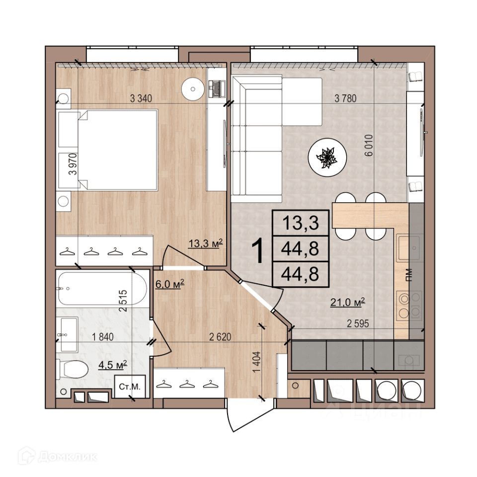1 комн. квартира в ЖК Skyline (Скайлайн), площадь 44.8 м², жилая 13.3 м², кухня 21 м²