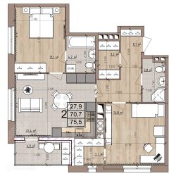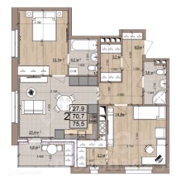 2 комн. квартира в ЖК Окская стрелка, площадь 75.5 м², жилая 27.9 м², кухня 20.4 м²