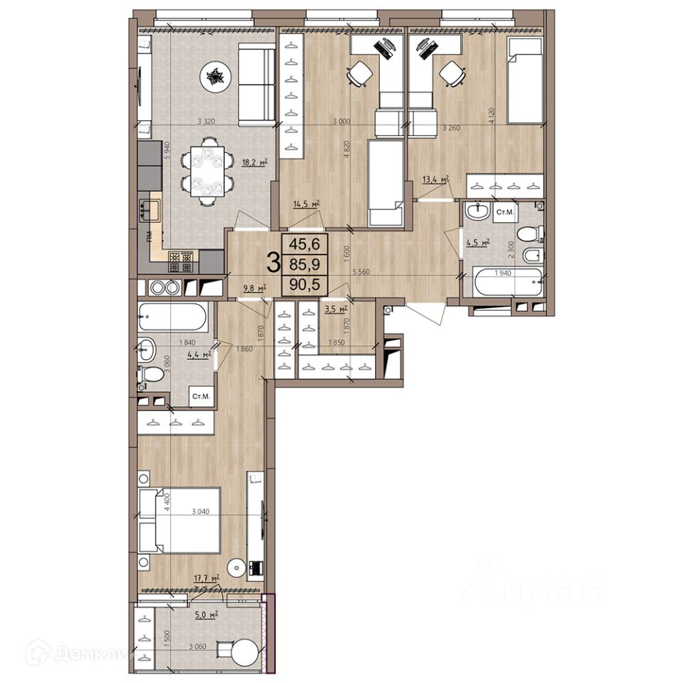 3 комн. квартира в ЖК Окская стрелка, площадь 90.5 м², жилая 45.6 м², кухня 18.2 м²