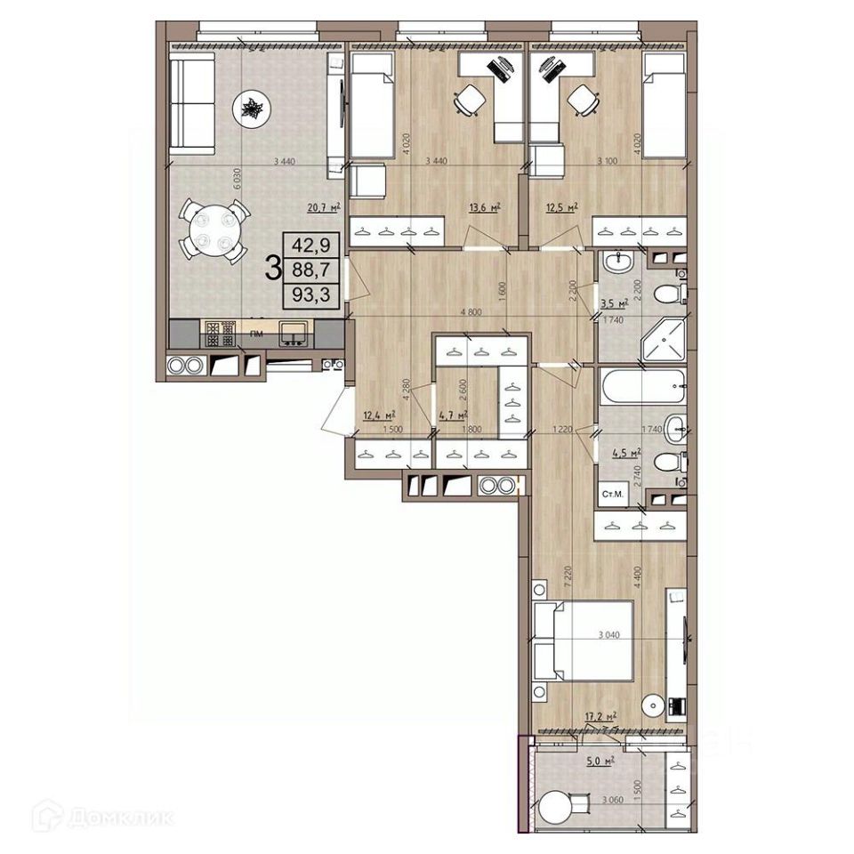 3 комн. квартира в ЖК Окская стрелка, площадь 93.3 м², жилая 42.9 м², кухня 20.7 м²