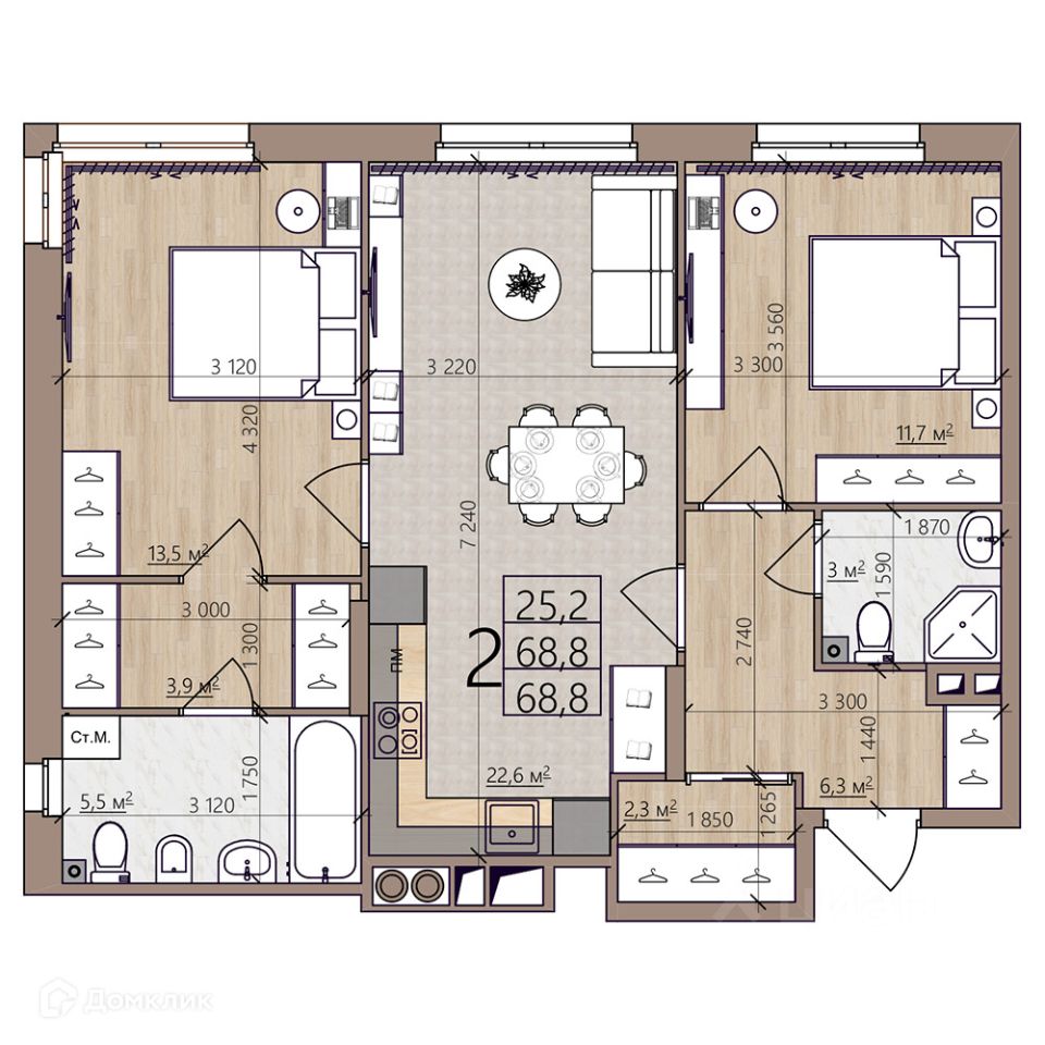 Общая площадь68,8 м²