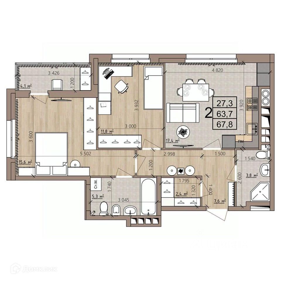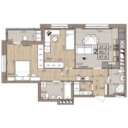 2 комн. квартира в ЖК Окская стрелка, площадь 67.8 м², жилая 27.3 м², кухня 17.4 м²